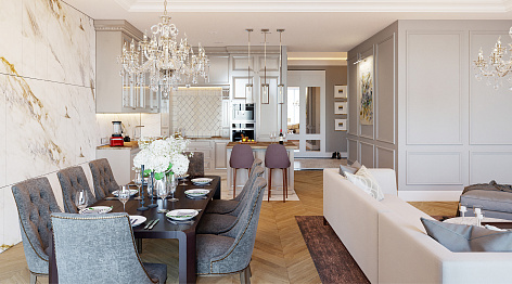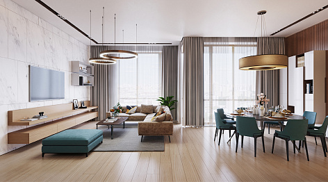 Архитектурное бюро «А+А» вместе со Sminex разработало интерьеры, стиль которых считывается даже при отсутствии мебели и дополнительных элементов декора. Сами стены, пол и потолок уже транслируют заявленный ар-деко, классический или современный стили. При этом в каждом помещении: кухня-гостиная, спальня, кабинет, детская, прихожая, санузлы — есть свои индивидуальные, отличные от других помещений элементы, что делает интерьер нескучным и различным от комнаты к комнате.