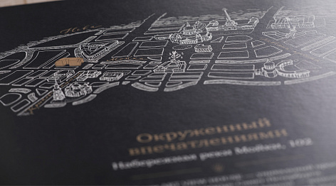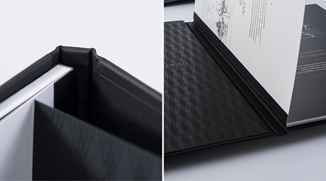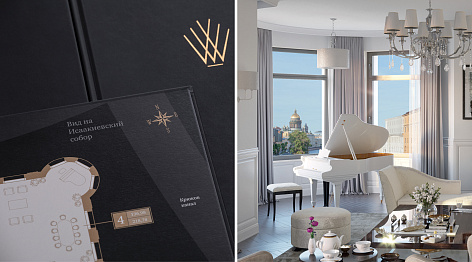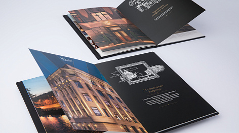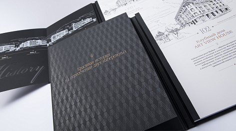 Каждая деталь брошюры была продумана так, чтобы подчеркнуть статус и стиль проекта. Обложка книги сделана из комбинированного материала. С одной стороны, это стильный элегантный материал с мягкой и шелковистой поверхностью, приятной на ощупь, с другой — дизайнерская бумага с клапаном, в который ненавязчиво спрятан исторический дух проекта.