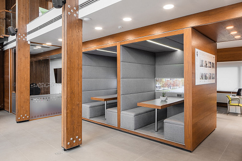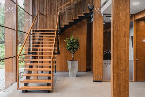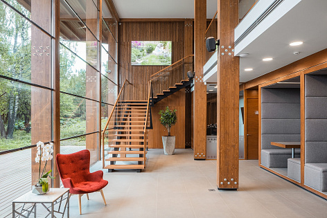 Каркас здания выполнен из клееной конструкционной балки, перекрытия - из бетона, а пространство главного атриума полностью остеклено и открывает вид на лес.