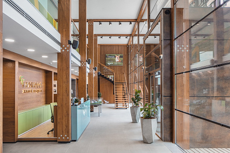 Для придания зданию ощущения экологичности стандартная система остекления на основе алюминиевого профиля была упразднена - длинные горизонтальные стекла фасада раскреплены между массивными деревянными колоннами, формируя единый фронт остекления высотой 8 метров.