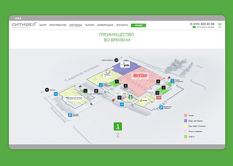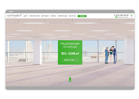 Кроме имиджевой презентации на сайте реализован полноценный подбор вакантных помещений, такой редкий для сайтов коммерческой недвижимости — визуальный и в виде списка. Специально для подбора помещения на этаже были сделаны визуализации каждого из 10 офисных этажей, увязанные с понятным интерфейсом выбора и с возможностью управляющей компании самостоятельно актуализировать вакантность.