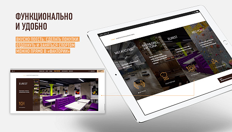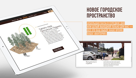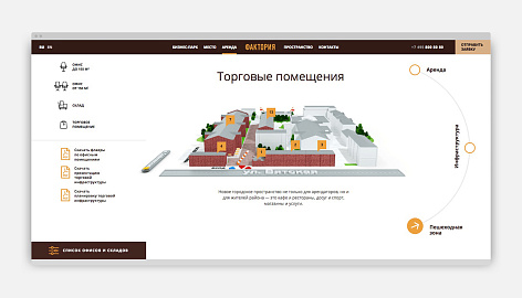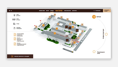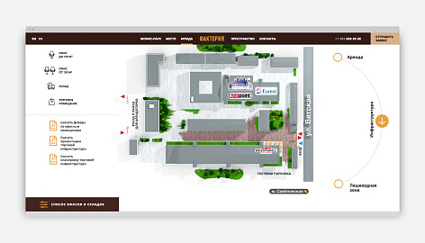 Задача сайта — донести новое позиционирование объекта до потенциальных арендаторов офисных и коммерческих площадей, мотивируя их выбирать «Факторию» для своего бизнеса. Кроме имиджевой презентации на сайте реализован полноценный подбор вакантных помещений, такой редкий для сайтов коммерческой недвижимости — визуальный и в виде списка.