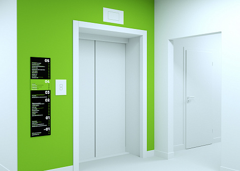 Мы предложили использовать озеленение в системе указателей по этажам и на входных группах, чтобы поддерживать метафору бренда «Теплица, в которой выращивают бизнесы». Оформили лифтовые холлы в единую систему с помощью системы навигации по этажам и выкраски лифта в фирменный зеленый цвет greenery.