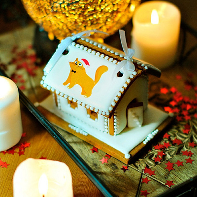 На одной стороне крыши имбирного домика был изображен логотип «Домашнего», на другой – кот Марьяныч.