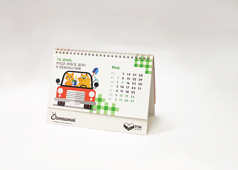Сопутствующие слоганы «Ты дома, когда…» играют двойную роль: подчеркивают условие, когда человек чувствует себя дома, а также отражают смысл иллюстрации. Например, иллюстрация к месяцу «май» изображает кота и кошку, которые едут на дачу в начале дачного сезона. Сопутствующий слоган: «Ты дома, когда любое дело в удовольствие».