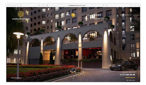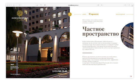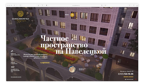 Концепция проекта максимально подчеркивает приватность проекта, его частное пространство в самом центре города. Мы создали детальную 3D–модель проекта в дневном и вечернем форматах, которая стала основой для сайта и фильма о проекте.