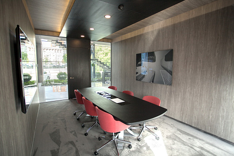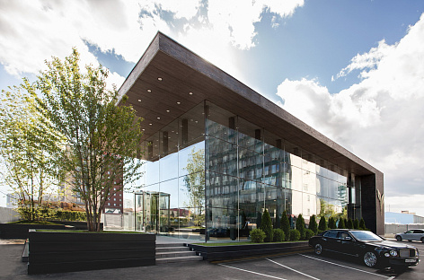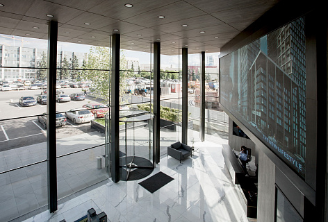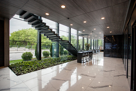 Сложнейшая инженерия здания полностью скрыта от глаз, чтобы не отвлекать внимание посетителей от премиального интерьера маркетингового офиса - покрытых шпоном дуба колонн, структурного остекления фасада, смонтированного на кронштейнах, специально сконструированных для этого здания, обтянутых кожей столов переговорных. Все стены, потолки и двери, мебель - разыгрывают оттенки дуба серого цвета, которые оттеняет белый мрамор пола. Респешен и столики в лаундж зоне выполнены из полированного гранита и мрамора. Интерьер в бело-серых тонах разбавлен алым цветом кресел в переговорных и ковром из экзотических растений с алыми бутонами, который занял место под лестницей, ведущей в шоу-рум.