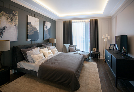 Лестница подчеркивает выверенный стиль интерьера и выполнена без центрального или боковых косоуров - она опирается на стекло и создает эффект парения в воздухе. Дубовые ступени, полностью совпадающие по цвету и фактуре с колоннами и расположенной рядом барной стойкой - ведут покупателя в роскошный шоу рум, повторяющий одну из квартир жилого комплекса и демонстрирующий доступный к покупке стиль отделки и мебелировки.