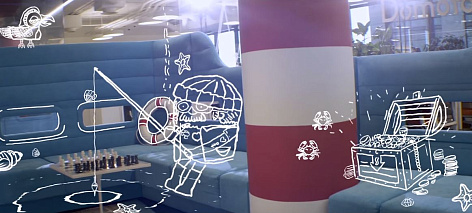 Мы придумали историю о том, как однажды сотрудник компании Авито приводит на работу своего сына, и дальше мы видим пространство офиса глазами ребенка: видим, как оживают рисунки на стенах, как появляется сундук с сокровищами и настоящий пират, как расправляет паруса фрегат и как прыгают летучие рыбы.