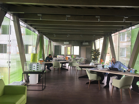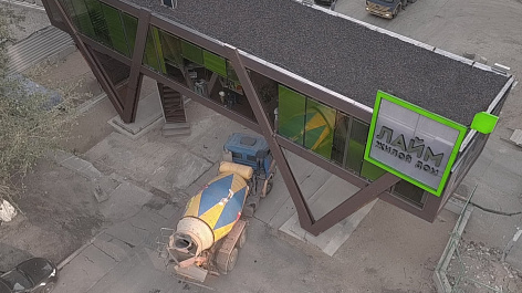 Въезд строительной техники расположен под зданием. С высоты 5 метров открывается вид на строительную площадку, офис служит рекламой: он отлично видим издалека, обладает уникальной архитектурой и очень функционален.