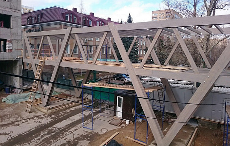 Располагать офис продаж в глубине участка и водить покупателей по строительной площадке - было запрещено, арендовать помещение в соседних зданиях никто не хотел, поэтому компанией A-HOLZ было предложено сделать офис продаж на опорах над въездом строительной техники.