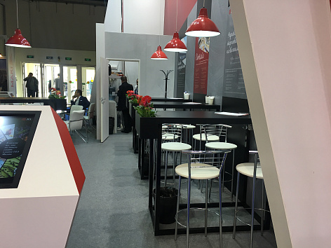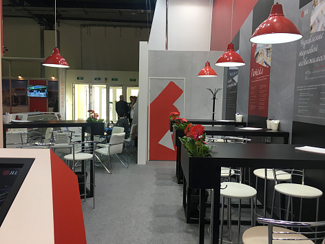 Стенд разработан согласно корпоративным стандартам с креативным исполнением стен в виде геометрических фигур.