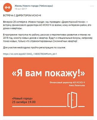 Встречи проходят в будние дни по вечерам — так, чтобы всем было удобно посетить их после работы. Регистрация на «Директорский показ» возможна исключительно через социальные сети, количество участников ограничено. Этот проект — своеобразный бонус для подписчиков групп застройщика в социальных сетях.