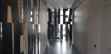 Также вход в офис оборудован “умной” домофонной панелью, далее расположена зона гардеробных шкафов, зона для чистки обуви и бахильница.