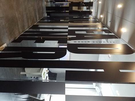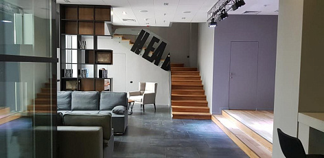 Первый этаж замыкается интегрированной в интерьер лестницей из натурального дерева и стекла, брендированной логотипами комплекса.