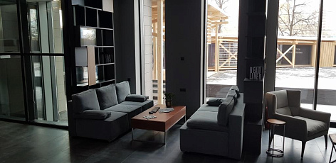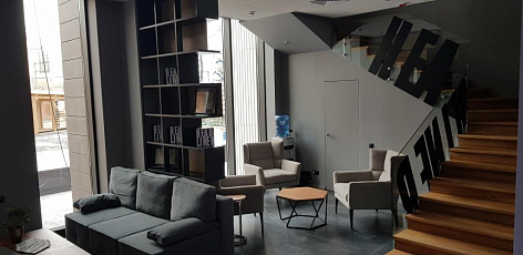 Напротив входа расположена стойка ресепшн (оформлена в стиле Headliner), декоративные полки оформлены логотипом комплекса из металла. Далее расположена сцена (для мероприятий в рамках закрытого клуба Headliner) с видеопанелью, звуковые колонки вмонтированы в потолок. Видеопанель подключена к стационарному компьютеру со выходом в интернет, а также имеет подключение к Apple TV и Chromecast. Напротив сцены расположена мягкая зона с диванами и креслами, в непосредственной близости находится кухня, оборудованная кофемашиной, варочной поверхностью, духовым шкафом и холодильником.
