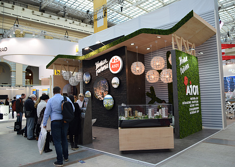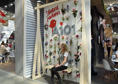 При создании стенда мы использовали натуральные материалы: дерево, натуральный мох, камень — чтобы точнее передать атмосферу будущего дома, располагающего парками, лесами, а главное, уютным и качественным жильем от надежного застройщика А101.
