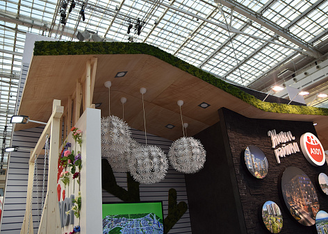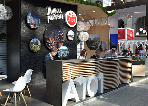 Выставочный стенд компании А101 разработан в рамках концепции «Живые районы». Современный, яркий и запоминающийся дизайн с акцентом на экологию, натуральность и комфорт. Стенд состоял из стойки ресепшена, клиентской зоны с голографическим и физическим макетами и фотозоны.