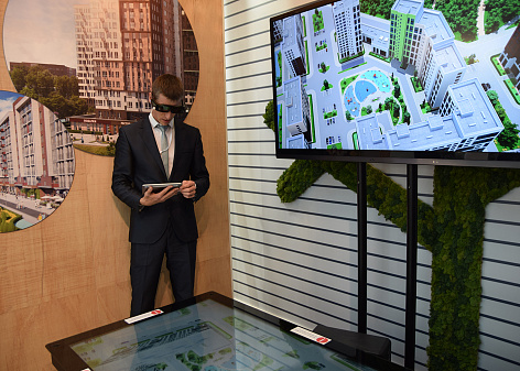 Мы установили голографический экран с объёмной моделью жилого района. В 3D-очках это выглядит, как горизонтальный экран размером со стол, на котором вырастает объёмная интерактивная модель района «Скандинавия».