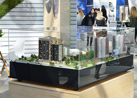 На стенде был представлен физический макет района "Скандинавия". Чтобы посетители могли подробно ознакомиться со всей территорией района, мы позаботились о том, чтобы макет можно было обойти со всех сторон.