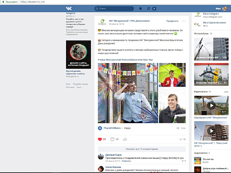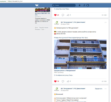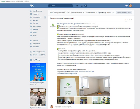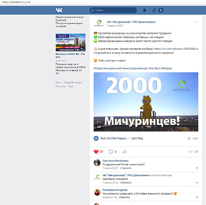 Группа создана одновременно со стартом продаж квартир в ЖК "Мичуринский". За первые 2 месяца без рекламного продвижения группа набрала 500 подписчиков.