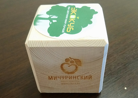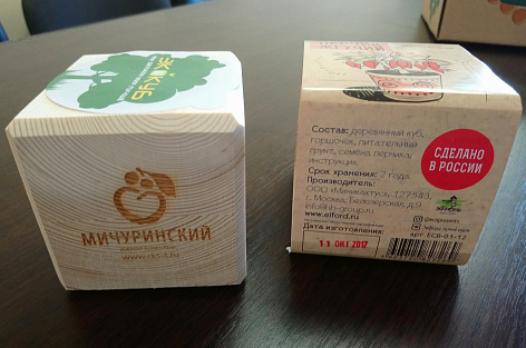 - Брендированный экокуб с инструкцией по применению. В кубе находится пакет с землей и пакетик семян. Сам куб служит горшком и резервуаром для земли, в которую необходимо посеять семена. В разных коробках различные семена: лаванда, жгучий перчик, базилик и т.д.