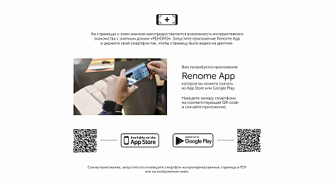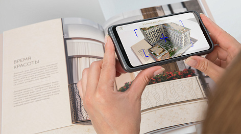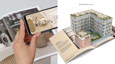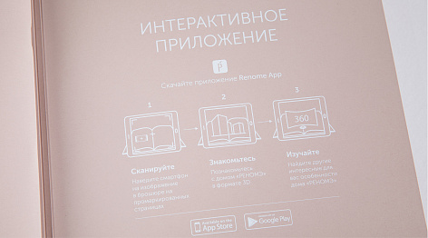 Мобильное приложение для App Store и Google Play сделало буклет по-настоящему интерактивным, предложив на первых страницах пользователю скачать приложение и изучать буклет буквально с телефоном в руках. Теперь клиент фактически забирает с собой панораму лобби и 3D-модель дома с возможностью перемещаться по нему, выйти во двор и изменить время суток, переключаясь одним нажатием со дня на ночь.