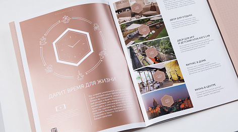 С одной стороны, дизайнерская бумага была обработана тремя видами технологий: тиснением, конгревом и шелкографией, — которые приятны глазу. С другой — брошюра создает ощущение комфорта благодаря выбранной мягкой тактильной бумаге.