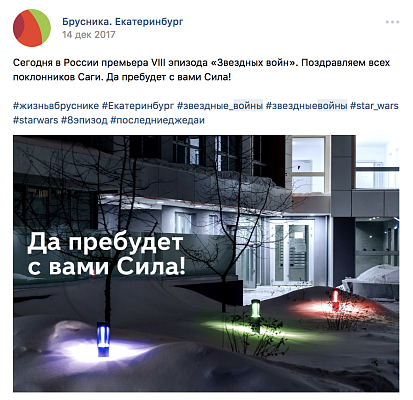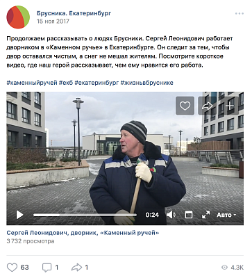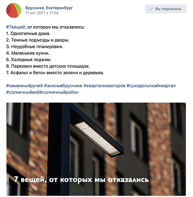 Мы работаем с большим сегментом аудитории: кто думает о покупке, уже купил в Бруснике и ждёт переезда, уже живёт в Бруснике; эксперты рынка, журналисты. Мы показываем, что и как строит Брусника. Её подход и принципы работы. Таким образом, все площадки Брусники в социальных сетях объединяются в одно СМИ под брендом Брусники.