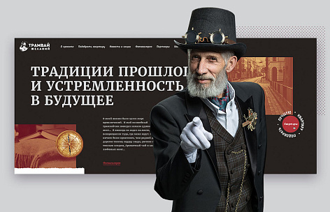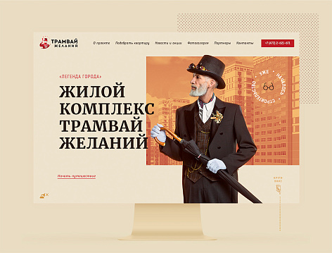 Жилой комплекс «Трамвай желаний» — не просто дом, а легенда города, место, где рождается сказка и исполняются желания. Смесь архитектурных форм и решений из разных стран и эпох, сочетание стиля ретро и современного комфорта. Сделали промо-страницу с погружающими в легенду интерактивами и объединили ее с традиционными техническими разделами. Выбрали ретро стиль и сепию, как основную цветовую гамму. Главный герой — интеллигентный пожилой джентльмен в классической «тройке» с элементами стимпанка в образе, белыми перчатками фокусника и шляпой, полной чудес. Ритмичная и завлекающая, фоновая мелодия погружает в атмосферу волшебства, дополняет картину и помогает творить легенду.