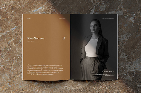Плавающая нумерация меню. Меню в буклете является скорее не техническим, а стилеобразующим. Нумерация появляется не на каждой полосе, а зависит от композиции текста. Также она меняет местоположение относительно контента вправо и влево и красной линией проходит по всему изданию.