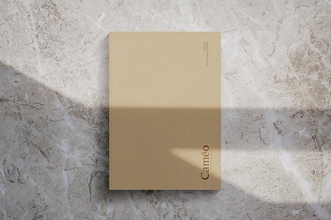 Исполнение. Буклет проекта создан как премиальная книга, которая, попадая в руки клиента, дает ощущение респектабельности и благородства. Книга изготовлена из дизайнерской бумаги Arctic Volume White, которая наилучшим образом передает цвета рендеров и 3D-рендеров будущего комплекса. Обложка книги обтянута итальянской тканью Toile du marais Grege. Тиснение логотипа Caméo выполнено из золотой фольги.