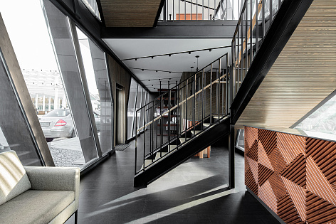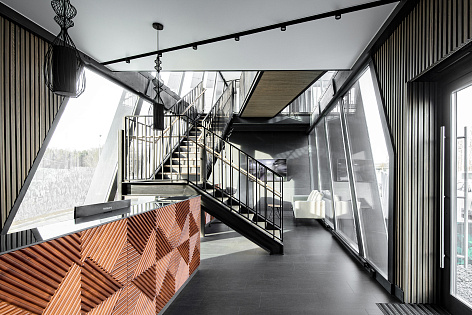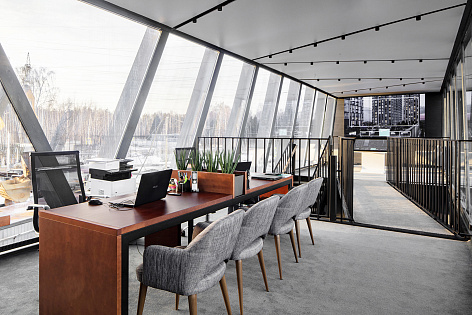 На втором этаже, помимо рабочих мест менеджеров по продажам, расположен архитектурный макет с интерактивной поквартирной подсветкой, выполненный в масштабе 1:87. При выборе понравившейся квартиры она выводится на видеостену из девяти экранов.