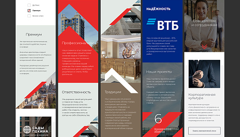 Сайт девелопера такого уровня невозможно ограничить разработкой агрегатора предложений на главной странице. И поэтому ключевой акцент намеренно смещён в сторону представления компании: её уникальных преимуществ, качества, надёжности и подхода. Последовательный рассказ о застройщике плавно переходит к его проектам.