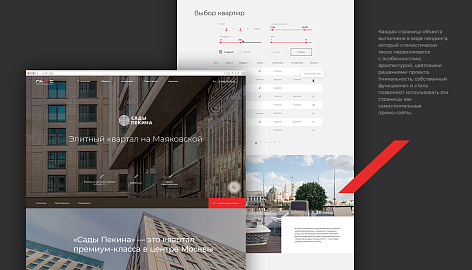 Строящиеся и реализованные объекты всегда наследуют главные преимущества девелопера: уникальность, качество, интеллигентность. Ни один из проектов застройщика не является типовым, а значит, цель представления каждого – максимально погрузить посетителя в атмосферу, показать неповторимость и особенности объекта. Все проекты представлены в виде уникальных лендингов в единой концепции, но в разной стилистике, отражающей преимущества каждого из творений застройщика.
