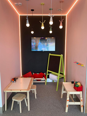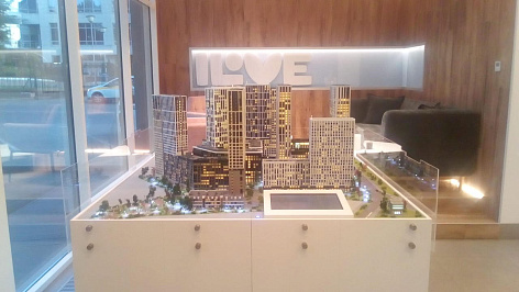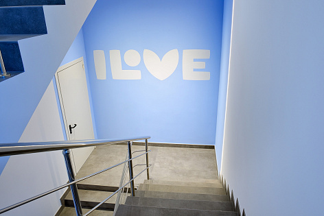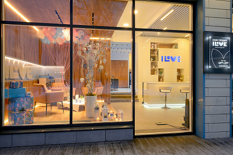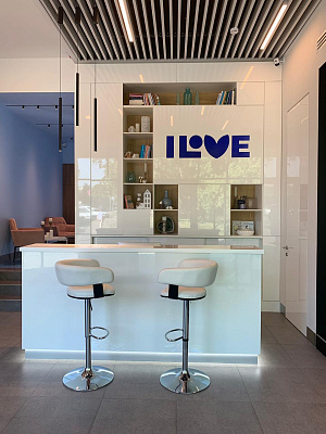 Трёхэтажный офис продаж ЖК ILOVE создан для того, чтобы с самого порога клиенты смогли ощутить хюгге-атмосферу, которой будет проникнут весь семейный квартал ILOVE. Светлые переговорные комнаты с панорамным остеклением и видами на листву деревьев, интерактивный архитектурный макет комплекса, детская комната с мультиками и игрушками и два шикарных шоу-рума, в которых можно опробовать систему "Умная квартира". А в холле первого этажа — уютные кресла и столик. Сюда можно прийти просто выпить кофе и почитать книжки о хюгге, которых много в библиотеке офиса продаж.
