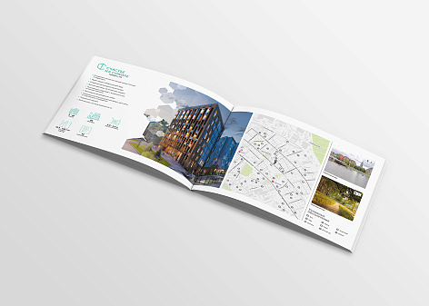 Оригинальной особенностью буклета является специальный вырубной карман, оборудованный на 3 полосе обложки: в нем очень удобно размещать планировки интересующего проекта.