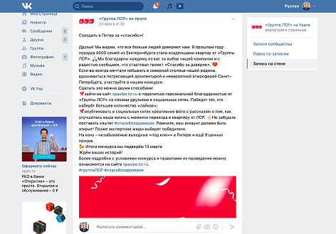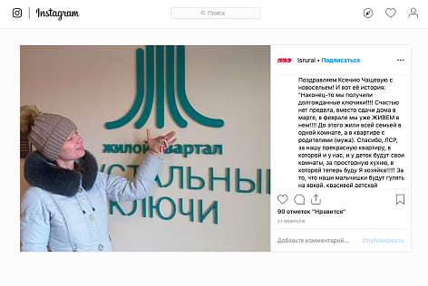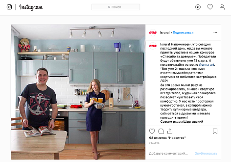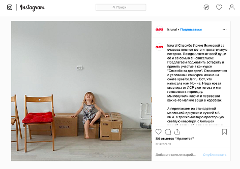 2) Спустя неделю со старта первой части спецпроекта мы запустили дополнительный конкурс в соцсетях. Жителям предлагалось сделать креативное фото в квартире от «Группа ЛСР» или на фоне одного из жилых комплексов (для тех, кто еще не получил ключи, а только недавно заключил договор долевого участия), которое продемонстрирует все преимущества жизни в жилых комплексах от «Группы ЛСР!». Также мы попросили рассказать, как изменилась жизнь людей после переезда в новую квартиру. Фотографиями пользователи делились в социальных сетях под хэштегом #спасибозадоверие.