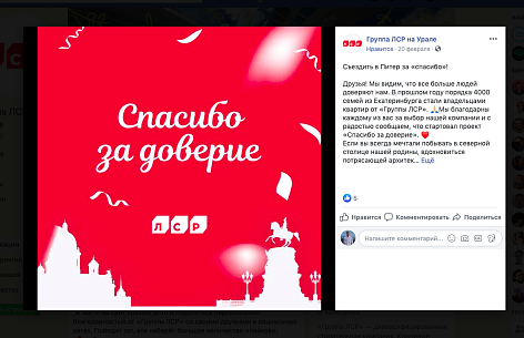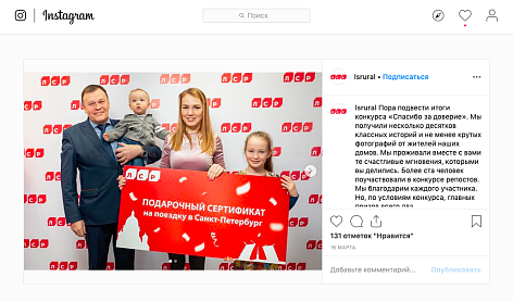 1) По итогам спецпроекта в соцсетях победители получили призы из рук генерального и коммерческого директоров уральского подразделения «Группы ЛСР». Для обладателей первых мест и их близких за счет компании была организована туристическая поездка в Санкт-Петербург, на родину «Группы ЛСР».