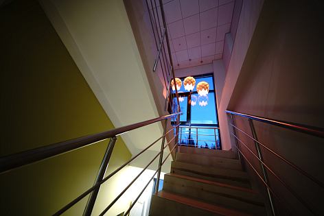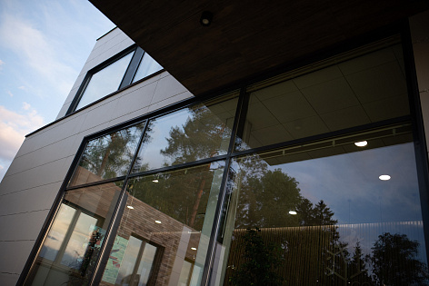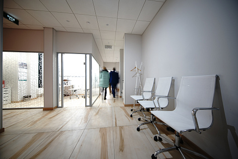 Дерево служит основным элементом отделки офиса продаж. Использование спокойного и уверенного фирменного серого цвета в сочетании с нейтральным белым в оформлении помещения усиливают восприятие бренда потребителем.
