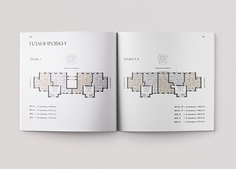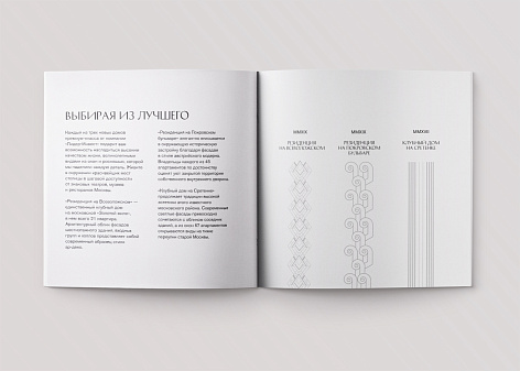 Обложка брошюры исполнена в дизайнерской бумаге Keykoloyr 300гр Grey fog. В нижней части обложки располагаются миниатюры трех паттернов, приподнятые конгревным тиснением и напечатанные шелкографией тоном чуть темнее бумаги. Это позволяет при первом касании почувствовать формы современного ар-деко и австрийского модерна.