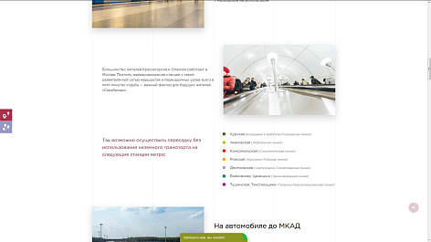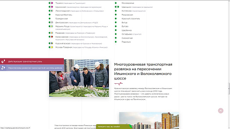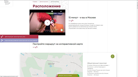 Так, например, непростая транспортная доступность проекта на сайте транслируется как основное преимущество – раздел транспортная доступность включает схемы, интерактивные карты, видео и детальное описание перспектив развития транспортной системы района к моменту заселения миниполиса.