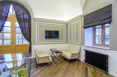 Концепция интерьера для офиса продаж взяла свое начало с существующей исторической кузницы (памятника архитектуры 18 века), где сами формы здания и внутренние помещения говорили за себя.