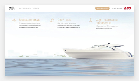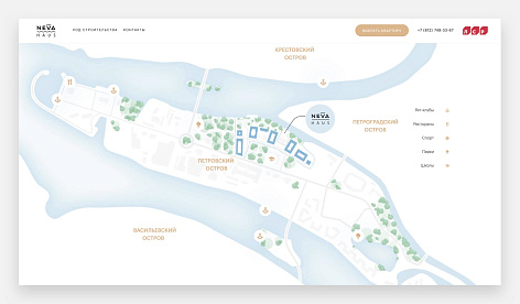 Neva Haus — это элитный комплекс на Петровском острове, расположенный на берегу Невы. Вокруг него яхт-клубы, парки и престижные рестораны. Локация и окружение — основные преимущества проекта, поэтому важно было обратить на них внимание пользователя. Мы сделали анимацию карты на главной странице с поэтапной прокруткой, где последовательно показывались все плюсы расположения комплекса. При создании сайта нужно было не просто создать продающий сайт, а отразить особый стиль жизни. На сайте реализован зрелищный визуальный поиск: пошаговый, чистый, не перегруженный деталями.