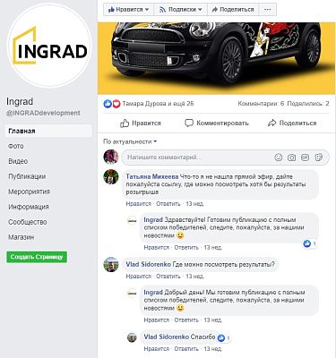 Итоги: конкурс вызвал широкий отклик среди действующих и потенциальных клиентов компании. Подход организаторов к позиционированию конкурса превратил розыгрыш в настоящий квест. Итоговому мероприятию, которое прошло в центральном офисе ГК «Инград», предшествовало распространение серии вирусных видеороликов, снятых в стилистике рисованных фильмов «Город грехов». Высокие показатели посещаемости всех онлайн-ресурсов компании в период говорит о том, что «Награда от Инграда» стала точным попаданием в аудиторию.