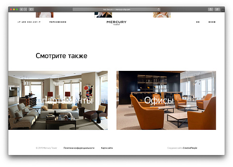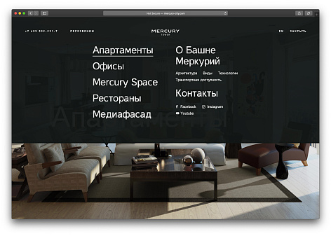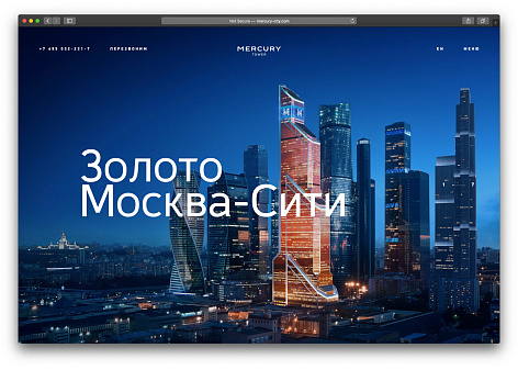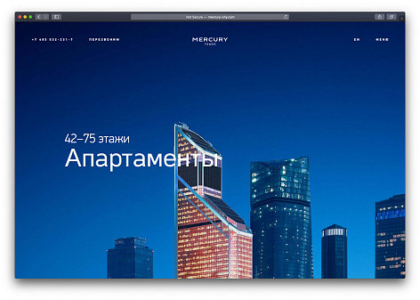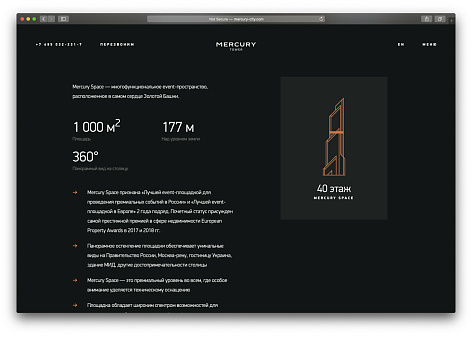 Нашей задачей было подчеркнуть многофункциональность Меркурия: в башне расположены апартаменты с панорамными видами, концертная площадка, офисы и рестораны. Меркурий — лауреат множества премий в недвижимости, и на сайте необходимо было отобразить все преимущества комплекса.