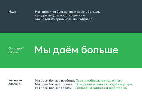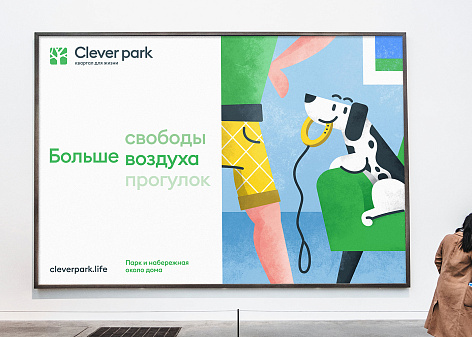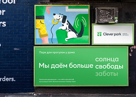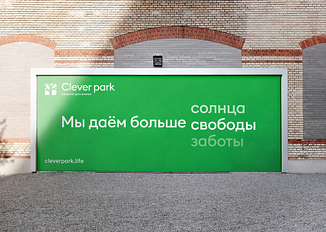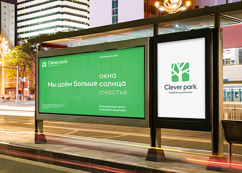 Ключевая идея бренда, отраженная в его платформе, заключалась в том, что Clever park обеспечивает жильцов совершенно новым уровнем комфорта в городской среде и, в действительности, существенно превосходит ожидания. Опираясь на это УТП бренда, агенство разработало креативную идею, выраженную в слогане «Мы даем больше». Столь амбициозная идея была обоснована конкретными преимуществами бренда, начиная от больших панорамных окон и большего количества сервисов заканчивая более широкими инфраструктурными возможностями (парк, своя набережная итд).