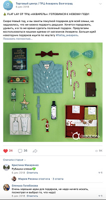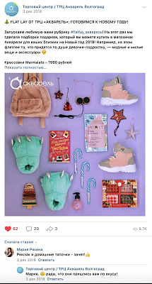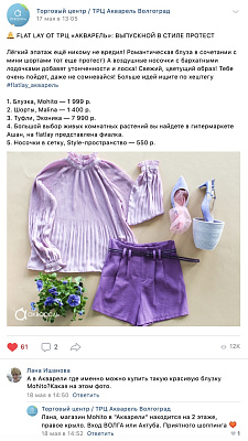 Публикации флетлеев всегда набирают хорошую обратную связь в виде лайков и комментариев: пользователи комментируют, какая вещь им понравилась, задают уточняющие вопросы по местонахождению отделов, где можно купить вещи, представленные на флетлее.