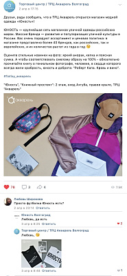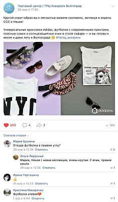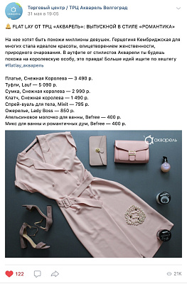 На страницах официальных соцсетей ТРЦ Акварель Волгоград регулярно публикуются подборки с использованием одежды и аксессуаров арендаторов ТРЦ с акцентом на недавно открывшиеся магазины. Вся одежда и акссесуары собираются во флетлеи и фотографируются на территории ТРЦ, то есть контент уникальный. Образы выкладываются в официальных группах ТРЦ с практичными комментариями стилистов и подробным классификатором самых необходимых и модных предметов гардероба с указанием, где купить в ТРЦ Акварель.<br>