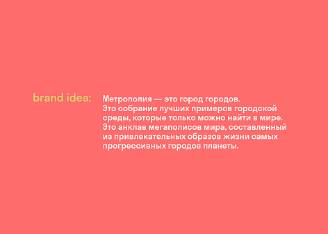 Что касается дизайн-решения, то здесь агентство пришло к максимально современным, космополитичным и «airbnb-шным» решениям. Динамичная цветовая палитра расширяет возможную цветовую градацию бренд-коммуникаций. Стиль имеет достаточное количество свободы, чтобы открывать новые плоскости восприятия. Находка с выделением в коммуникациях Me на всех языках мира создает уникальный визуальный Tone of Voice бренда Ме_трополия, который теперь может говорить с нашей целевой аудиторией на всех языках мира. Возможные коммуникационные сообщения: «Posto per il meglio?», «Jouis de chaque moment», «Träume wahr werden», «Наши места общего пользования».